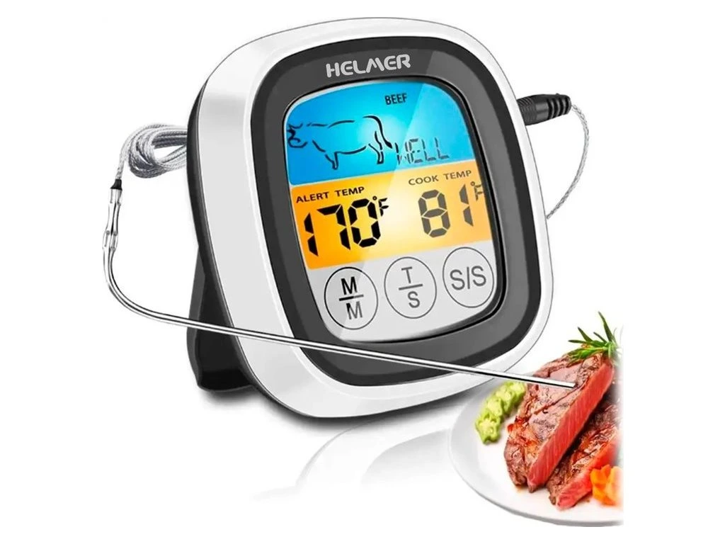 Kuchyňský vpichový teploměr umožní přesné měření teploty masa či zeleniny v rozmezí -20 °C až 300 °C. Stačí zapíchnout sondu do pokrmu, umístit jednotku s displejem mimo troubu, pánev nebo gril a na dálku kontrolovat průběh pečení. K dispozici je také funkce časovače, která vás upozorní alarmem na dosažení přednastavené teploty nebo času. Pro usnadnění je vybaven 8 přednastavenými teplotami dle vybraného druhu masa: hovězí, jehněčí, telecí, hamburger, vepřové, krůtí, kuřecí a ryby. Samozřejmostí je možnost nastavení míry propečení v 5 stupních. Teploměr je vybaven výklopným stojánkem a magnety pro snadné uchycení na kovový povrch.