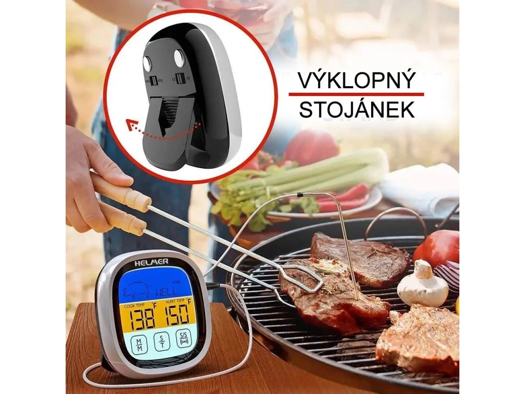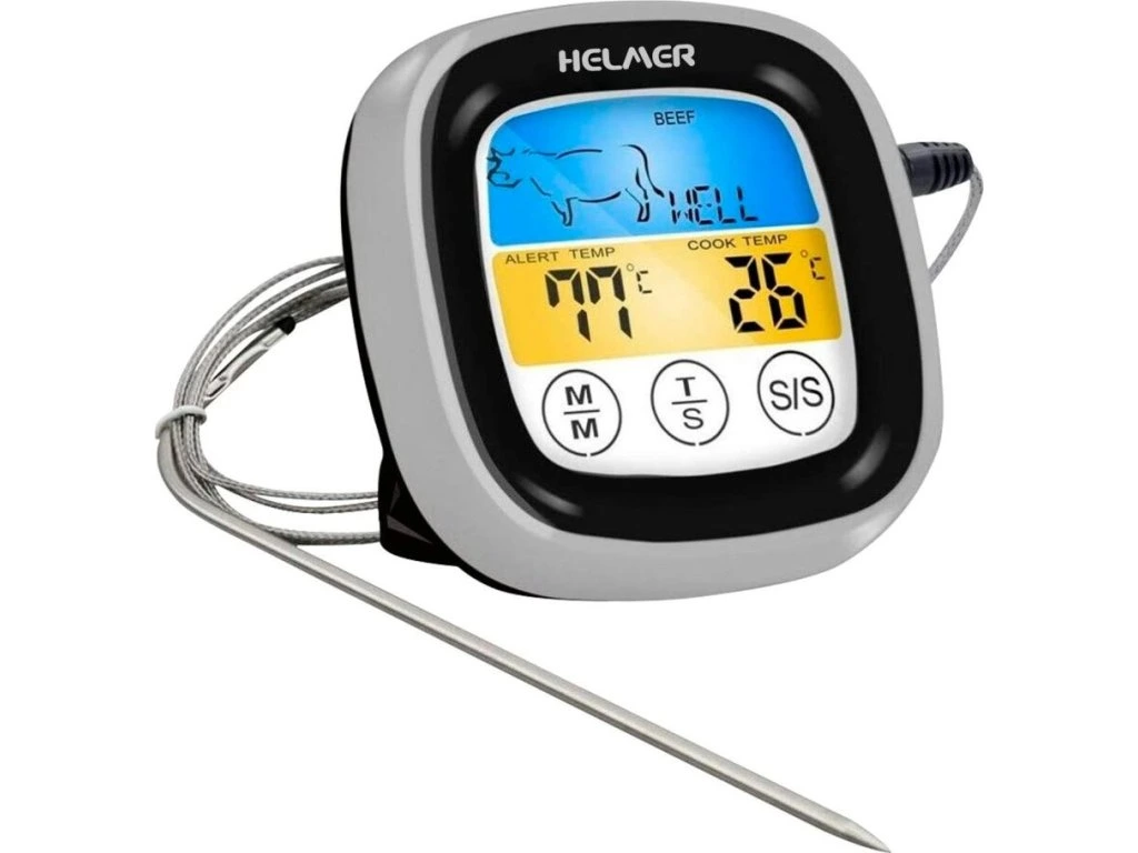 Digitální kuchyňský teploměr Helmer TM 23, se kterým během pár sekund získáte přesnou teplotu masa nebo zeleniny během pečení, grilování nebo vaření. Stačí jen zapíchnout připojenou sondu a za okamžik se teplota zobrazí na digitálním displeji. Teploměr podporuje měření v rozsahu -20 °C až 300 °C, díky čemuž je vhodná pro rozmanité druhy masa a dalších potravin. Mezi další přednosti patří 5 přednastavených úrovní pečení, aby vše bylo ještě jednodušší. Helmer TM 23 disponuje také časovačem a zvukovým alarmem teploty, takže přesně víte, kdy je jídlo hotové. Na zadní straně je přítomen magnet, který zajistí snadné uchycení na kovové předměty, ledničku apod. Praktický stojánek umožní také pohodlné umístění na stůl.