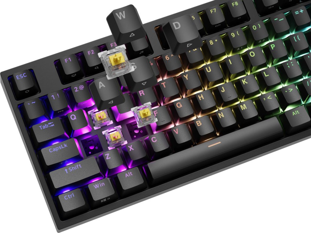 - 5kolíkové zásuvky Hotswap umožňují výměnu jakýchkoli spínačů bez použití nářadí.