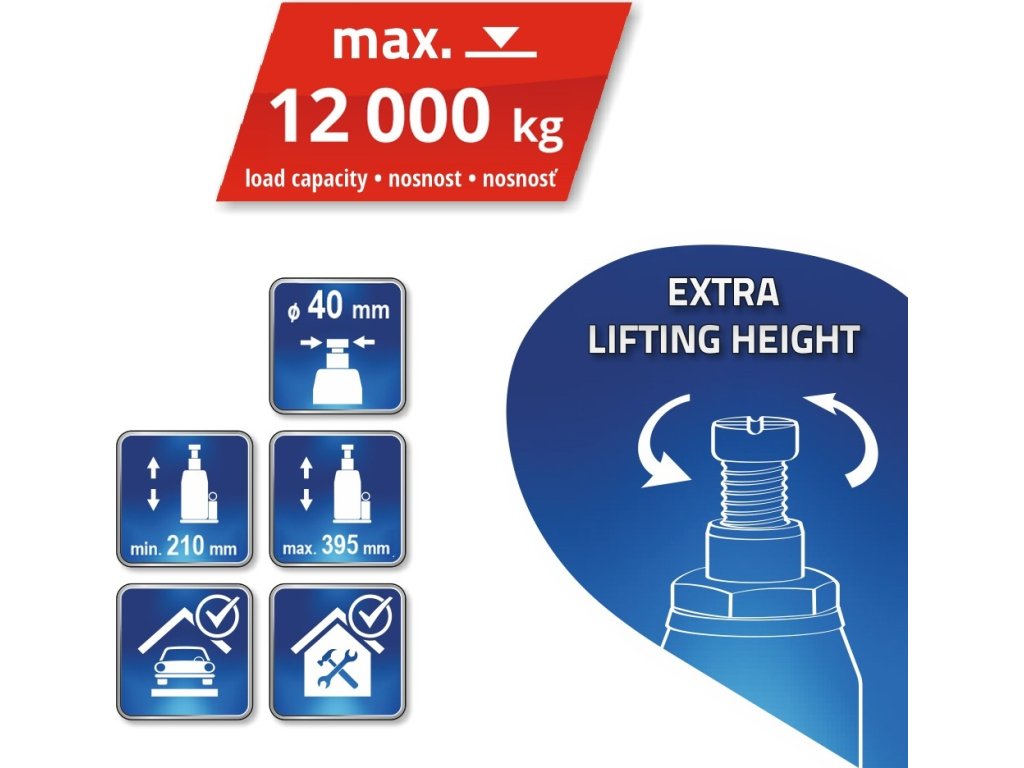 Hydraulický hever s maximální nosností 12t a volitelnou pracovní výškou zvedáku.