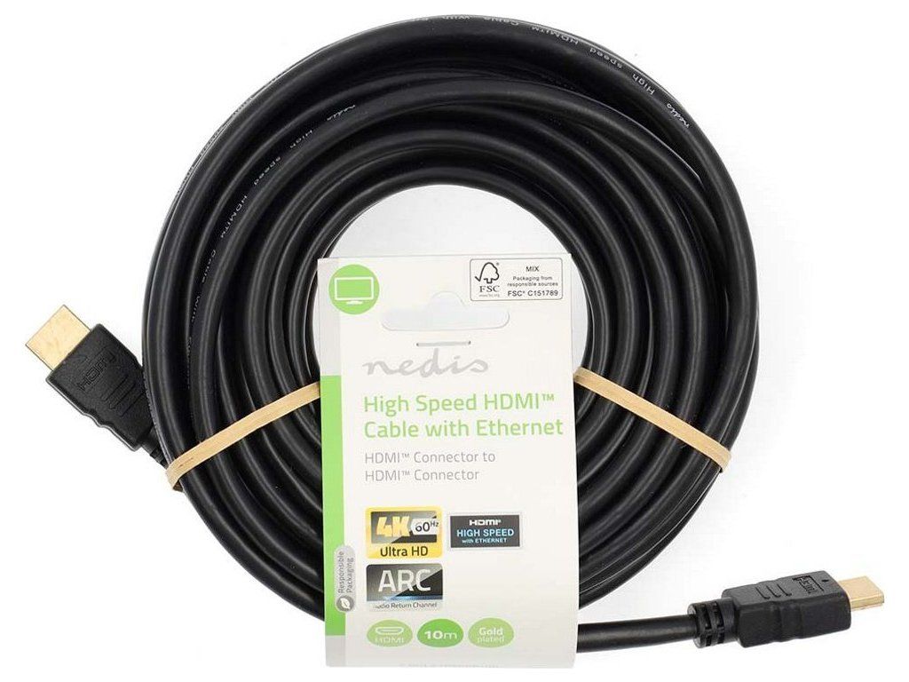 Nedis HDMI 2.0 kabel s Ethernetem 10 mHigh Speed HDMI 2.0 kabel s Ethernetem a zlacenými konektory je vhodný k propojení jednotlivých zařízení. Podporuje přenos videa v rozlišení 4K při 60 Hz a funkce jako je ARC (Audio Return Channel), HDCP nebo 3D obsah ve Full HD.