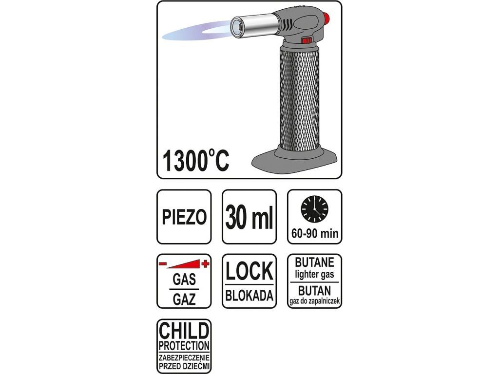 Hořák dosahuje maximální pracovní teploty 1300 °C. Zhotovení z hliníkového tělo s protikluzným povrchem má kapacitu 30 ml, umožňující pracovat 60 - 90 minut.