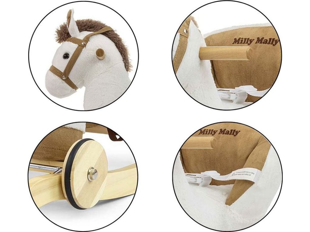 Měkoučký houpací koník Polly byl navržen pro nejmladší děti, pro které jsou tradiční houpací koně příliš velké. Pohodlné a tvarované sedadlo ve tvaru křesla a nastavitelné popruhy poskytují pohodlí a bezpečnost během bezstarostného houpání vašeho dítěte. Opěrky pro nohy na lištách a rukojeti ještě více pomáhají udržet rovnováhu. Překlopením jednoduchého mechanismu na lištách vysunete kolečka, čímž ve vteřině změníte houpací hračku v jezdícího koníka. Houpací lišty lze jednoduše odšroubovat. Po stisknutí ouška koník vesele zařechtá, po stisknutí druhého vydá zvuk klusajícího koně. Baterie se vkládají do poudra umístěného na bříšku.