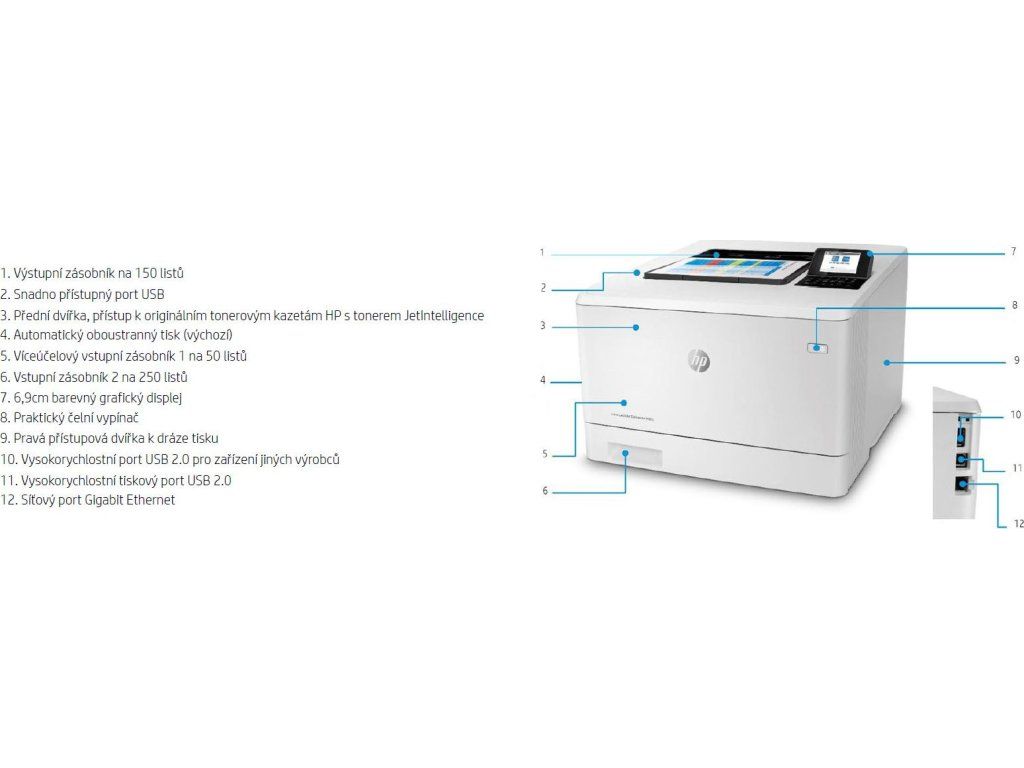 Obsah balení: Tiskárna HP Color LaserJet Enterprise M455dn; Černá originální tonerová kazeta HP LaserJet (cca 2 400 stran); Azurová, purpurová, žlutá originální tonerová kazeta HP LaserJet (každá kazeta cca 2 100 stran); Úvodní příručka; 1x napájecí kabel