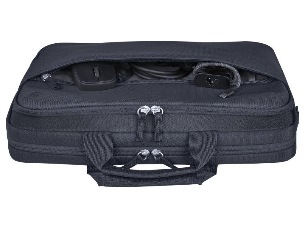 Pro notebook je vyhrazena polstrovaná přihrádka, která jej chrání před nárazy a poškrábáním. Další úložný prostor a kapsy pojme všechny nezbytnosti, které během dne potřebujete – například tištěné dokumenty, psací potřeby apod. Rukojeť a odnímatelný ramenní popruh vám umožní pohodlný a flexibilní transport.