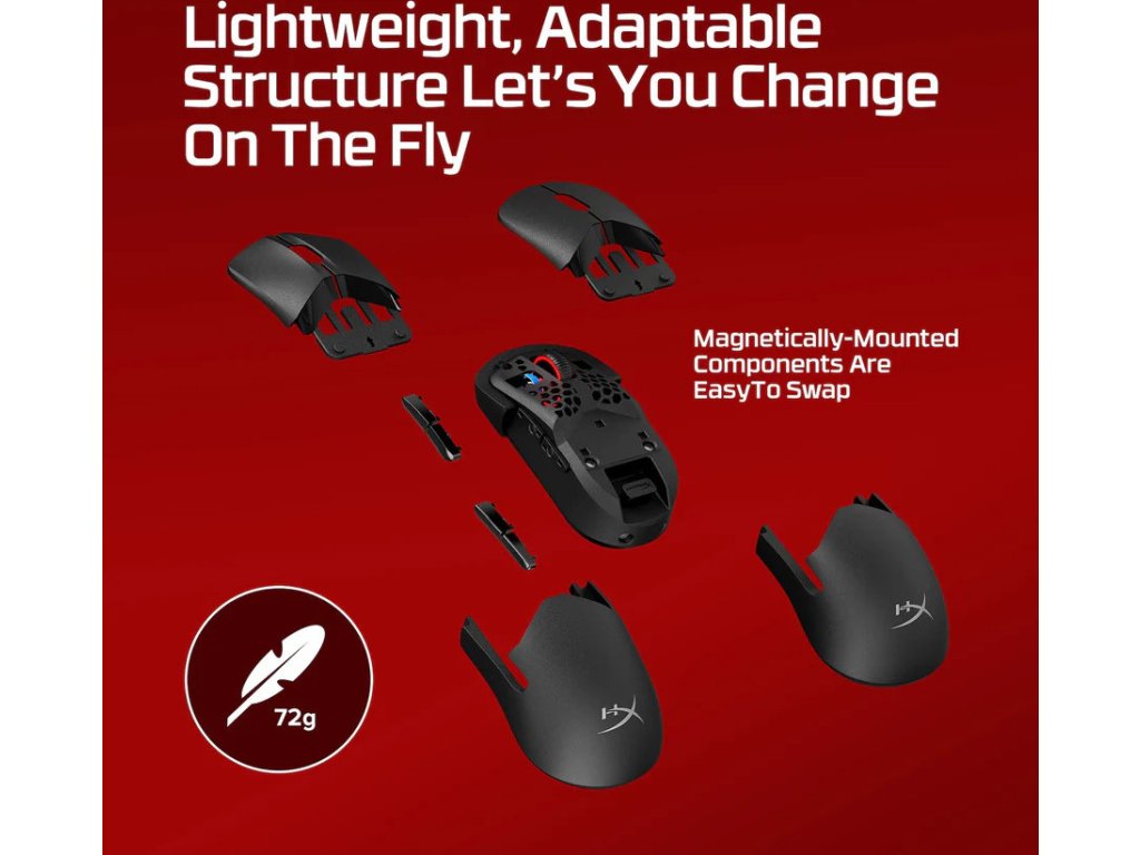 Pozdravte nejpřizpůsobitelnější herní myš HyperX: Pulsefire Saga Pro. Tato myš využívá ergonomicky navržené vyměnitelné součásti pro přizpůsobení různým stylům úchopu s až 16 pohodlnými kombinacemi. Jednoduše vyměňte magneticky namontované součásti a najděte své dokonalé přizpůsobení zcela bez nářadí. Ať už zvolíte jakoukoli konfiguraci, tato myš váží pouhých 72 gramů, takže nikdy nebudete muset obětovat obratnost kvůli pohodlí. Dlouhé herní seance? Žádný problém! Upgrady tím nekončí. Pulsefire Saga Pro je také vybaven optickými spínači HyperX, které vyvažují laserově přesné ovládání pomocí hmatového kliknutí. Na rozdíl od tradičních spínačů, které vyžadují mechanický kontakt, optické spínače využívají mechanismus spouštěný světlem, který převádí kliknutí na okamžité akce. Žádné odskoky, žádné zpoždění. Pulsefire Saga Pro také nabízí duální bezdrátové připojení, využívající vysokorychlostní 2,4 GHz bezdrátový dongle nebo Bluetooth s kompatibilními zařízeními. Nebo se zbavte hardwarového klíče pomocí funkce Instant Pair a připojte se k herním notebookům OMEN bez jakýchkoli dalších komponent. Připojte se k softwaru HyperX NGENUITY a nastavte sledování pohybu až do 26k DPI, přemapujte tlačítka, upravte rychlost dotazování, nastavte vlastní RGB efekty a sledujte výdrž baterie.