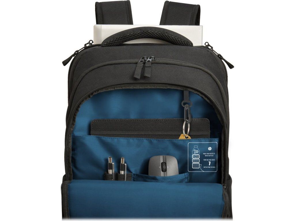 Stylový batoh HP Renew Professional 17,3" pro přenášení notebooku, který je praktický a navržen s ohledem na ekologii. Batoh je dostatečně prostorný, aby se do něj vměstnal velký notebook, příslušenství a další předměty, včetně odpolední svačiny. Vyznačuje se pevným a odolným zpracováním, díky čemuž efektivně ochrání váš notebook během přenášení. Navíc se snadno čistí, takže si uchovává svůj původní vzhled po dlouhou dobu. Hlavní část batohu HP Renew Professional byla vyrobena ze 100% recyklovaných plastů vylovených z oceánu. Další prvky jako štítky, šňůrky nebo vycpávkové hmoty jsou vyrobeny ze 100% recyklovaných a biologicky rozložitelných materiálů.