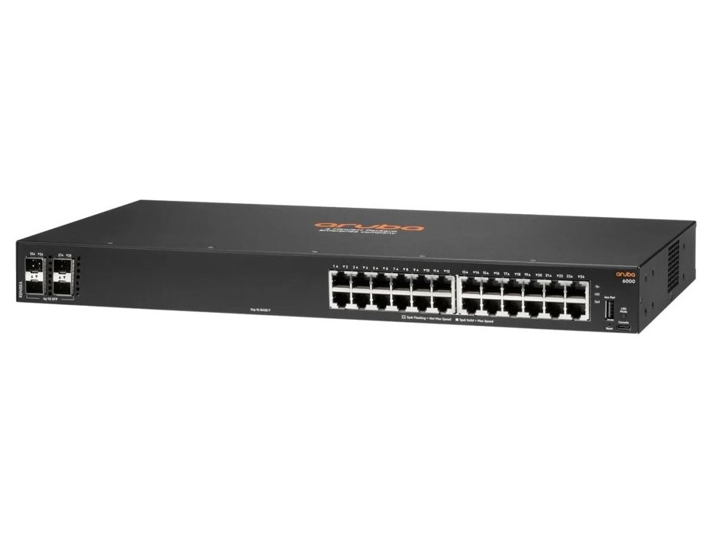 HPE Aruba 6000 24G 4SFPSpravovatelný switch nabízející 24× 10/100/1000 Mbps RJ-45 portů a 4× 1Gb SFP sloty. Přepínací kapacita switche je 56 Gbps a rychlost směrování činí 41,6 Mpps.