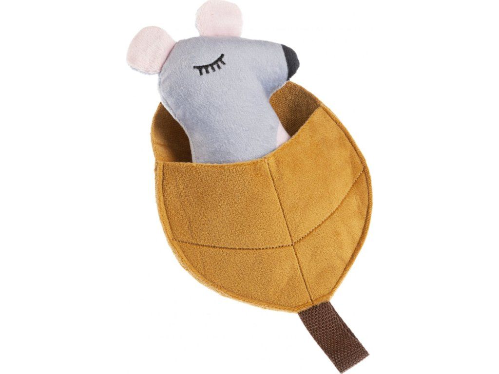 Plyšová myška v postýlce z listu je ospalá. Stisk ji probere, až zapíská. Až vašeho mazlíčka přestane zajímat, vraťte ji do postýlky. I hračky potřebují odpočinek. Materiálem je polyester, pískátko je všité uvnitř hračky.