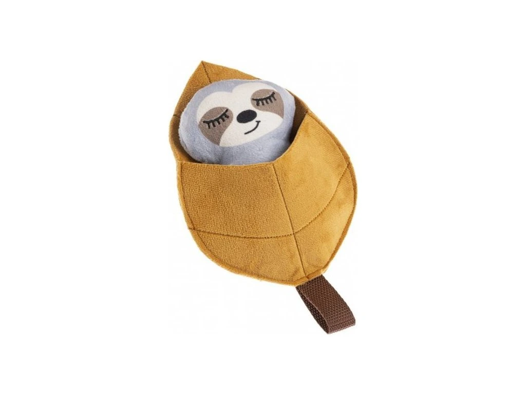 Plyšový lenochod v postýlce z listu je ospalý. Stisk ho probere, až zapíská. Až vašeho mazlíčka přestane zajímat, vraťte ho do postýlky. I hračky potřebují odpočinek. Materiálem je polyester, pískátko je všité uvnitř hračky.
