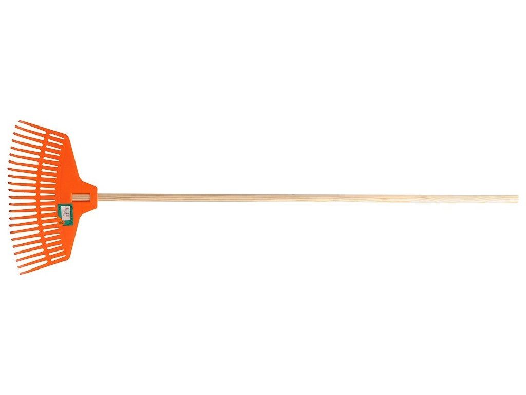 Lehký shrnovač listí vyrobený z odolného plastu a rukojetí z borovice.