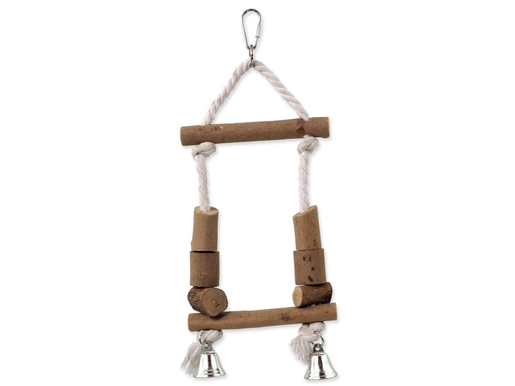 Závěsná dřevěná houpačka s lanem vhodná pro střední exotické ptactvo.