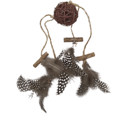 - Ratan, dřevo a peří jsou šetrné k tlapkám i zubům a dobře se drží v tlamičce.