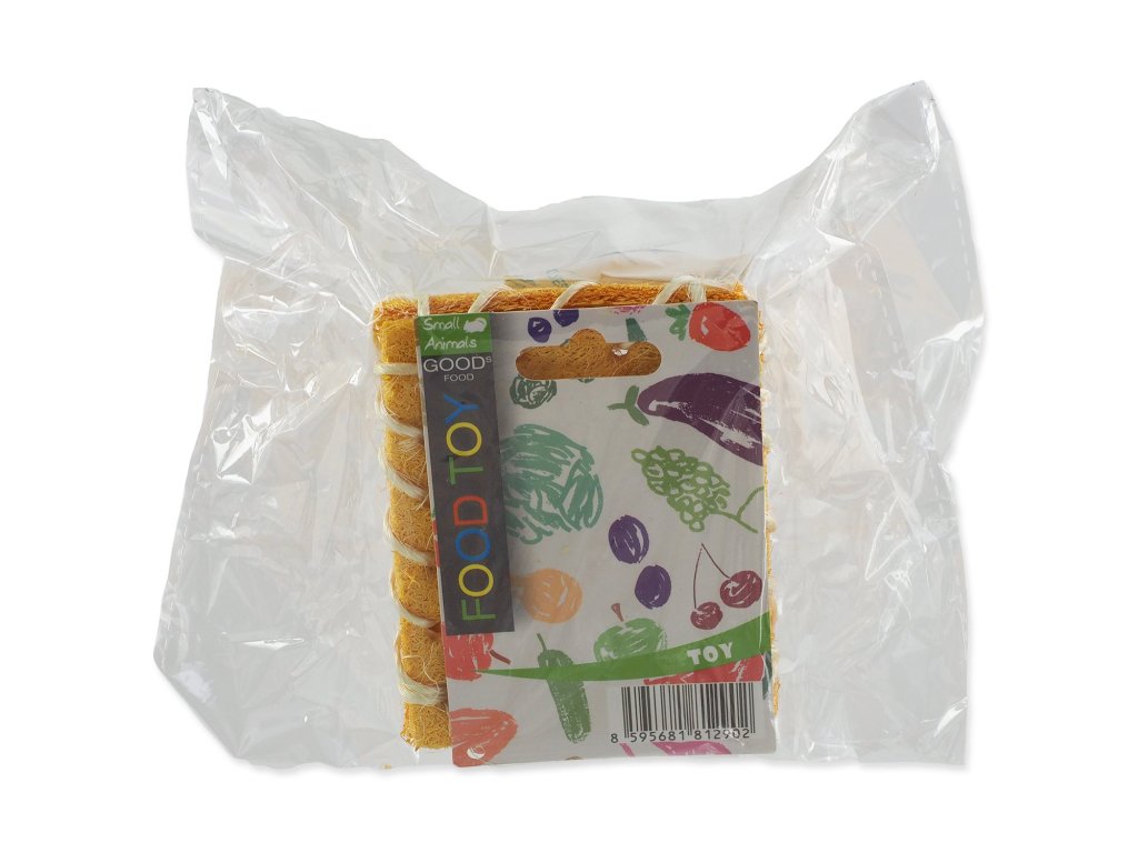 Vyrobeno z lufy - přírodní materiál bohatý na vlákninu a sisalového provázku. Obsahuje potravinářská barviva.