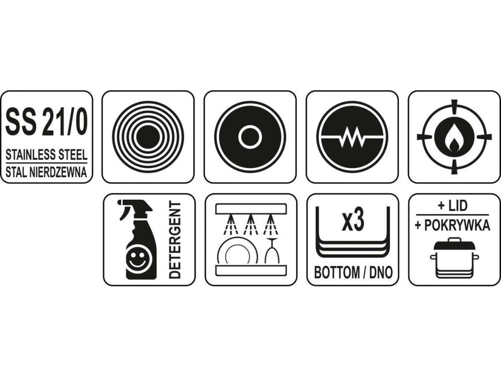 Boky hrnce a poklice jsou vyrobeny z hrubší oceli, která udržuje teplotu déle než u standartních hrnců z oceli 304. Hrnce YATO používají mimořádně pevné a neohřívací, pevně upevněné rukojeti. To zaručuje bezpečnost a mnoho let používání.