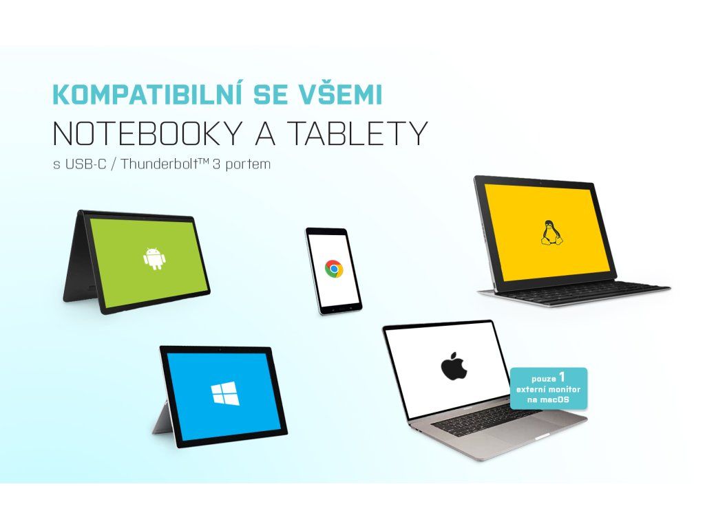 • Zařízení s volným USB-C portem s podporou “DisplayPort Alternate Mode” či portem Thunderbolt 3