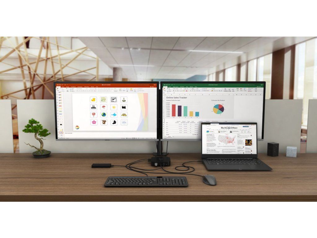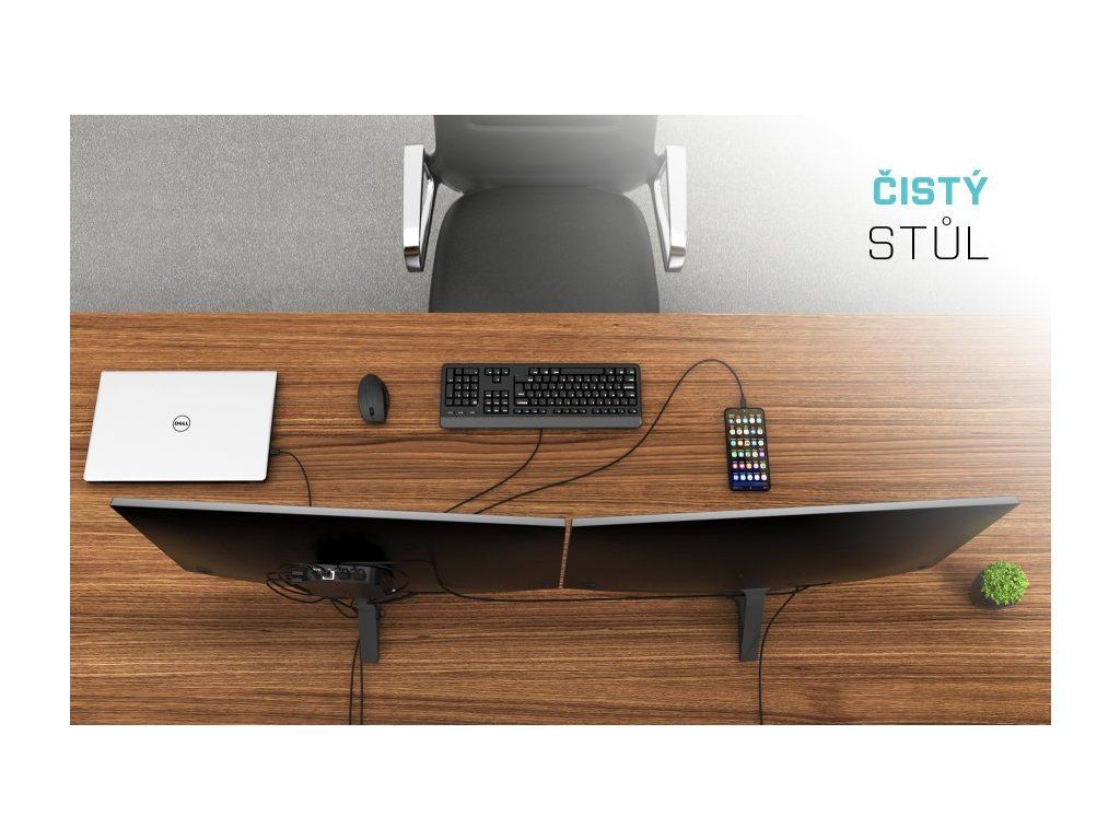 Kancelářská dokovací stanice USB-C, která podporuje až 2x externí monitor v rozlišení 4K. Stanice je kompatibilní s jakýmkoliv notebookem vybaveným portem USB-C nebo Thunderbolt 3. 6x USB port, spolehlivé a rychlé připojení do podnikové sítě díky integrovanému LAN portu a podpora instalace za monitor, to vše z této dokovací stanice dělá ideálního společníka pro profesionály. Samozřejmostí je podpora nabíjení vašeho notebooku či tabletu, a to až 100W (napájecí adaptér je přiložen).