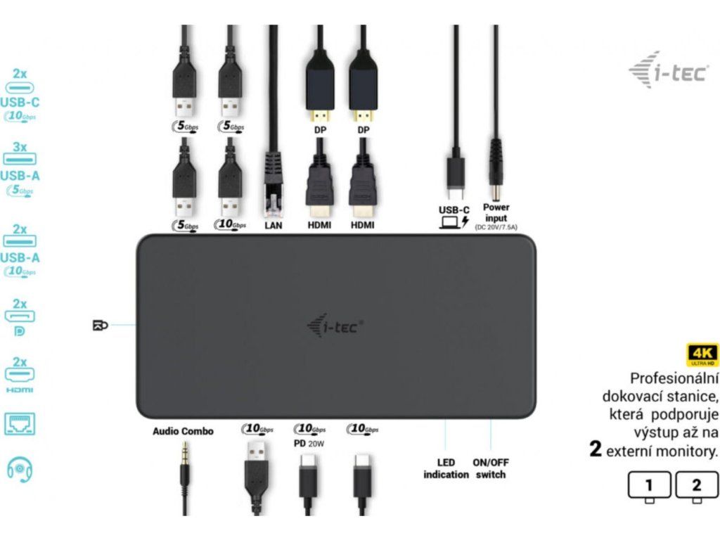 • Výkonná kancelářská dokovací stanice podporující superrychlé porty USB Gen 2 s rychlým nabíjením. Dokovací stanice podporuje výstup až na dva externí monitory ve vysokém rozlišení až 4K. Dokovací stanici lze použít prakticky se všemi notebooky, protože podporuje připojení ke všem běžným portům: 3.0, USB-C a Thunderbolt“ 3/4 a zároveň podporuje všechny běžné současné operační systémy.