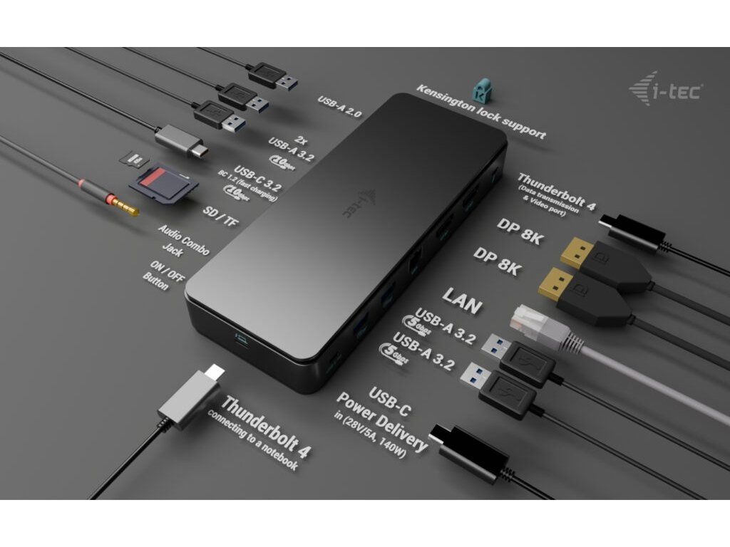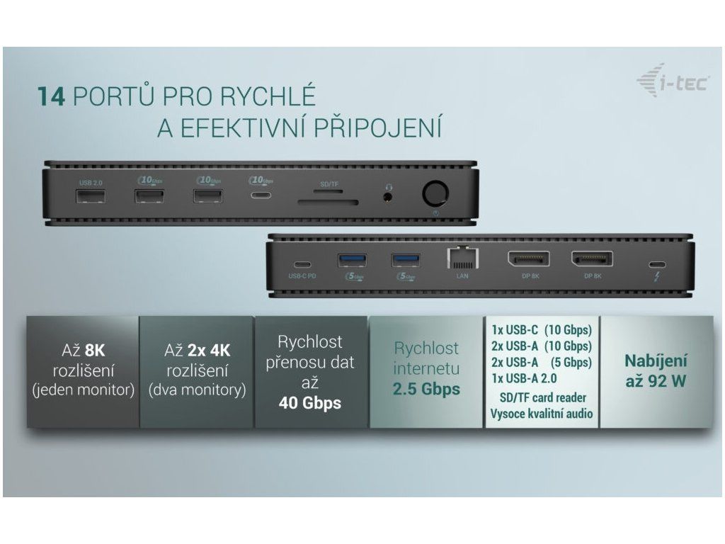 Dokovací stanice i-Tec nabízí širokou nabídku rozhraní a je kompatibilní s celou řadou moderních notebooků a tabletů. Disponuje porty DisplayPort nebo Thunderbolt 4 pro zobrazení obsahu až v ultra jemné 8K kvalitě při 30 Hz nebo sledování v režimu dvou obrazovek (2× 4K při 60 Hz). Port Thunderbolt 4 dále přináší také vysokou rychlost přenosu dat až 40 Gb/s, což oceníte při činnosti s velkými objemy dat – fotografie, videa nebo filmy ve vysokém rozlišení 4K.