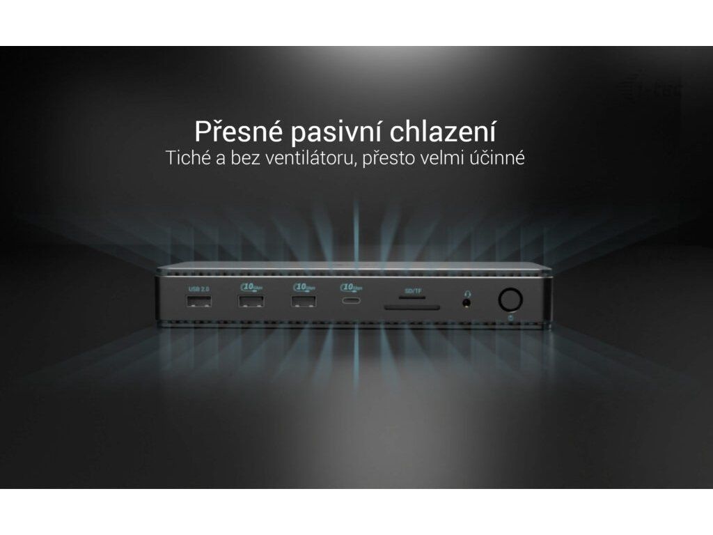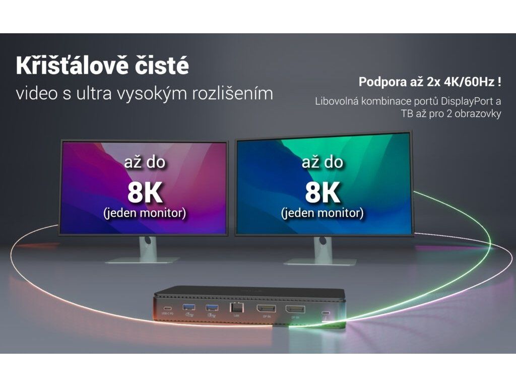Křišťálově čistá kvalita obrazu, super-rychlý internet a schopnost přenášet data rychlostí až 40 Gb/s díky portům Thunderbolt 4. Dokovací stanice má dále USB-C 3.2 Gen2 (10 Gbps), 2× USB 3.2 Gen2 (10 Gbps), 2× USB 3.0 (5 Gbps) a 1× USB 2.0 port. Taktéž můžete samozřejmě připojit vaše sluchátka či reproduktor a nabíjet váš notebook (92 W), to vše za pomoci jednoho jediného kabelu. Disponuje čtečkou SD a microSD karet. Potěší také 2.5G LAN Ethernet, který zaručí rychlé internetové připojení. Díky integrovanému protokolu DP 1.4 můžete tuto dokovací stanici připojit k monitoru s rozlišením až 8K (7680 × 4320) s obnovovací frekvencí 30 Hz, což odpovídá rozlišení čtyř 4K monitorů. To z něj činí ideální řešení pro grafiky, analytiky, vývojáře, filmové střihače nebo nadšence a milovníky videa ve vysokém rozlišení. Samozřejmostí je vypínač či slot pro bezpečnostní zámek.