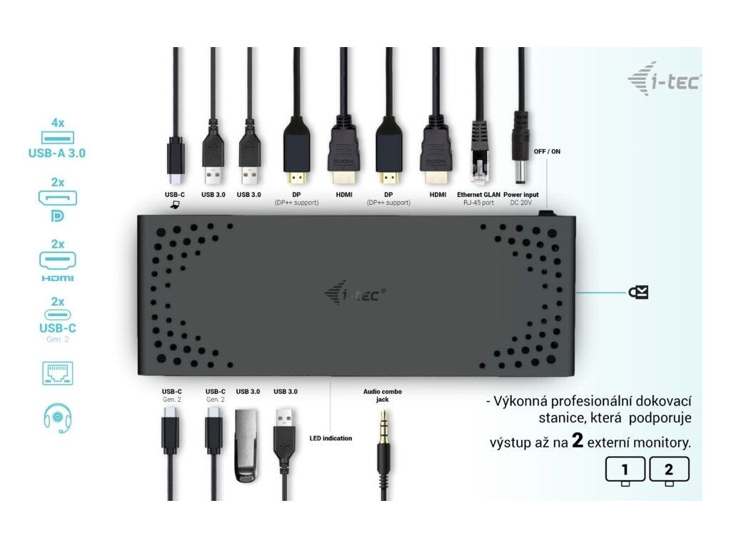 Výkonná kancelářská dokovací stanice s podporou superrychlých portů USB Gen 2. Dokovací stanice podporuje výstup až na dva externí monitory ve vysokém rozlišení až 4K. Dokovací stanici lze použít prakticky se všemi notebooky, protože podporuje připojení ke všem běžným portům: 3.0, USB-C a Thunderbolt“ 3/4 a zároveň podporuje všechny běžné současné operační systémy.