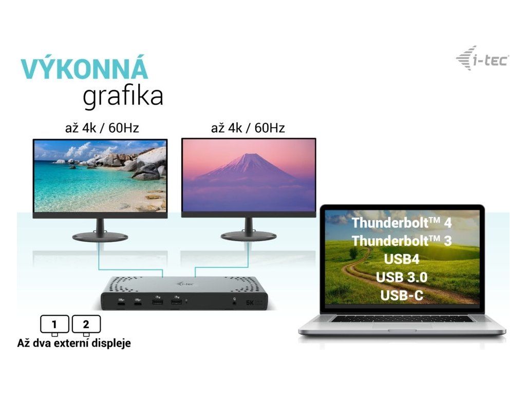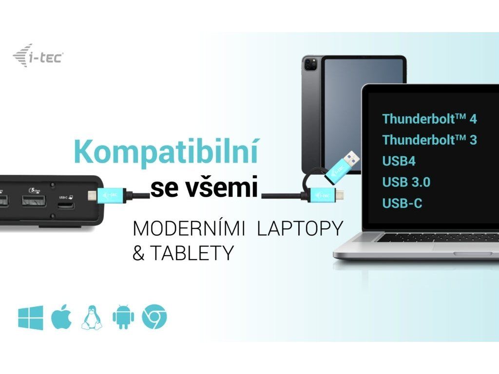 • Univerzální dokovací stanice kompatibilní s notebooky a tablety s rozhraním USB-C, USB-A a Thunderbolt.