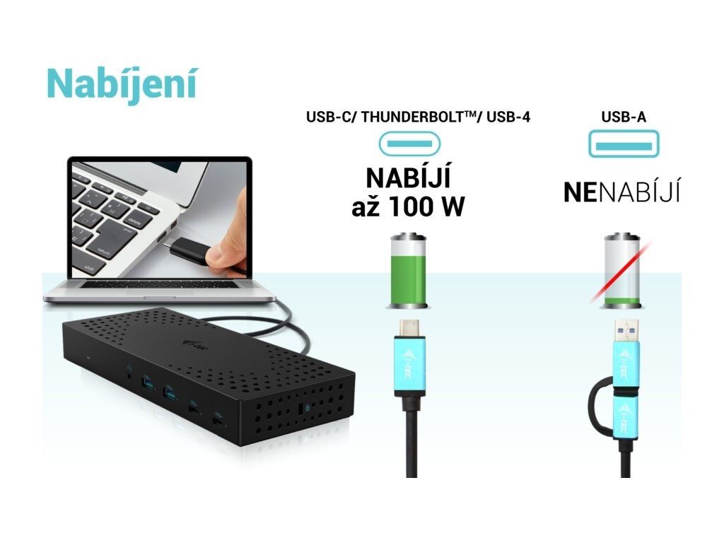 • Dokovací stanice podporuje až 100W napájení připojeného notebooku nebo tabletu (při připojení k příslušnému portu USB-C nebo ThunderboltTM. Při připojení k portu USB 3.0 nelze notebook nabíjet).