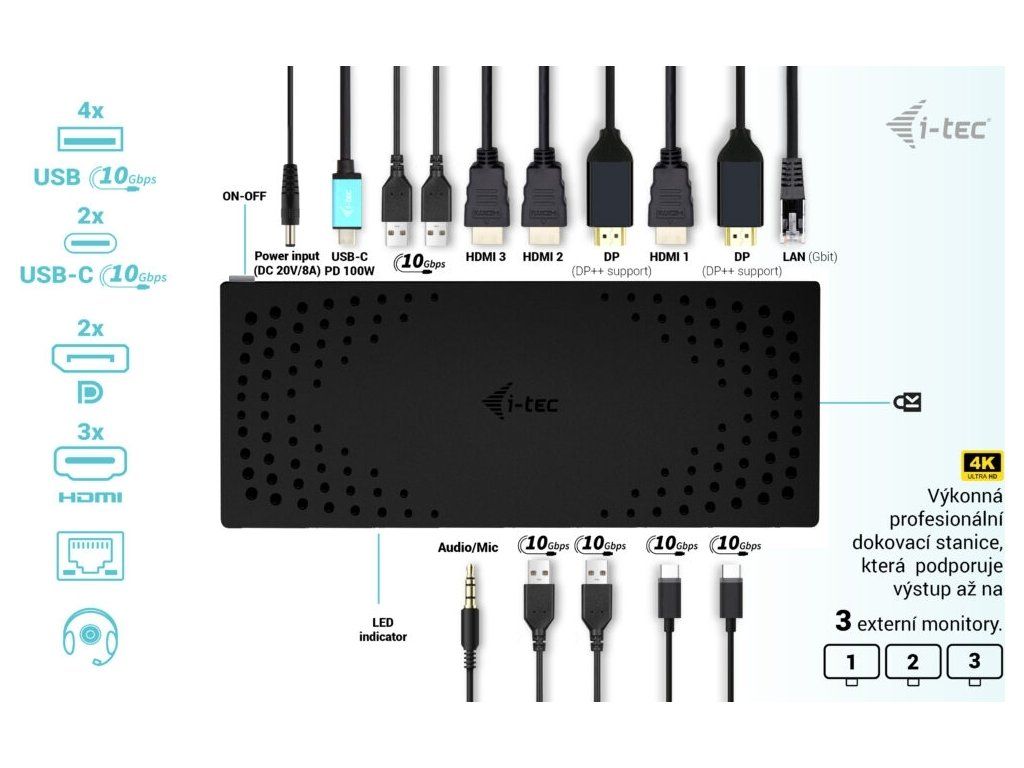 i-tec dokovací stanice Thunderbolt 4K/ USB 3.0/ 4x USB-A/ 2x USB-C/ 2x DP/ 3x HDMI/ LAN/ Power Delivery 100W