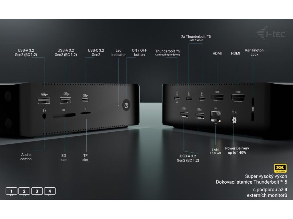 I-TEC Thunderbolt 5 Quattro Display Dock přestavuje moderní dokovací stanici, která vám umožní rychle a jednoduše připojit nejnovější periferní zařízení a vytvořit profesionální pracoviště nebo špičkové multimediální centrum. Ultra rychlý přenos dat, práce na více monitorech, extrémní flexibilita? Na to všechno je tu dokovací stanice I-TEC Thunderbolt 5.
