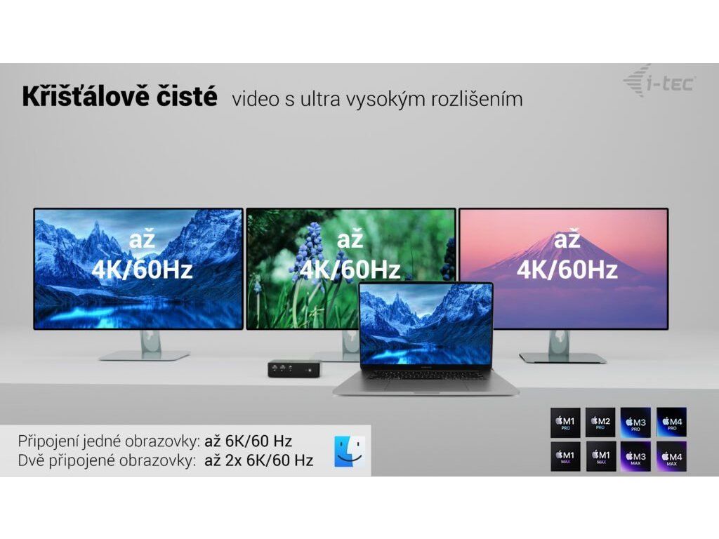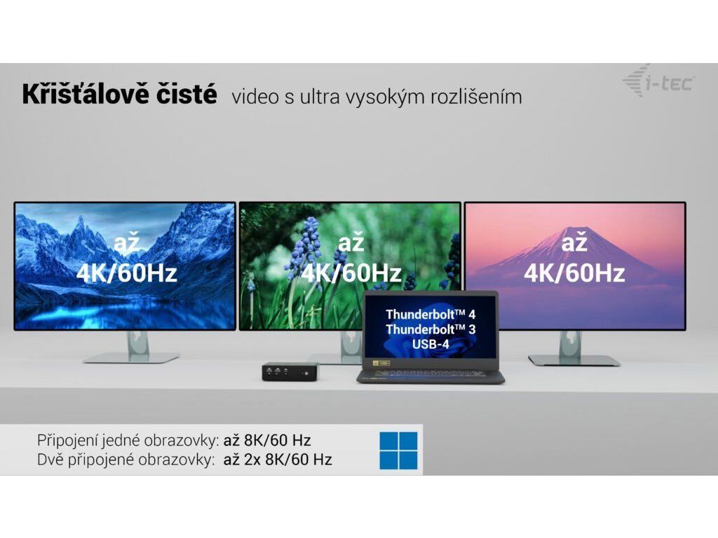 Provoz každého pracoviště je vázán na využívání dat. A když je jejich přenos pomalý, zpomalují se všechny klíčové procesy. Díky rozhraní Thunderbolt 5 je zajištěn přenos dat enormní rychlostí až 80 Gbps, respektive až 120 Gbps v jednosměrném režimu. Dokovací stanice I-TEC dále podporuje připojení až 4 externích monitorů, díky čemuž razantně zvětšíte svoji pracovní plochu, na kterou se vměstná každý projekt.