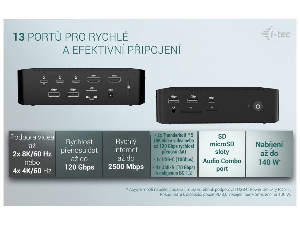 Nechybí ani konektory pro napájení notebooku o výkonu až 140 W. Díky podpoře USB-C a technologii Power Delivery 3.1 je ideální pro nabíjení moderních a výkonných zařízení. Ostatní konektivita zahrnuje rozhraní HDMI, USB pro flashdisky a další periferie. Vysokorychlostní připojení má na starost port LAN. Potěší také přítomnost čtečky SD karet a microSD karet. I-TEC Thunderbolt 5 Quattro Display Dock se vyznačuje kompaktní a snadno přenosnou konstrukcí. Současně je však hliníkové tělo odolné proti mechanickému poškození.