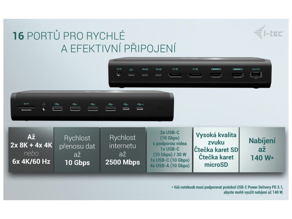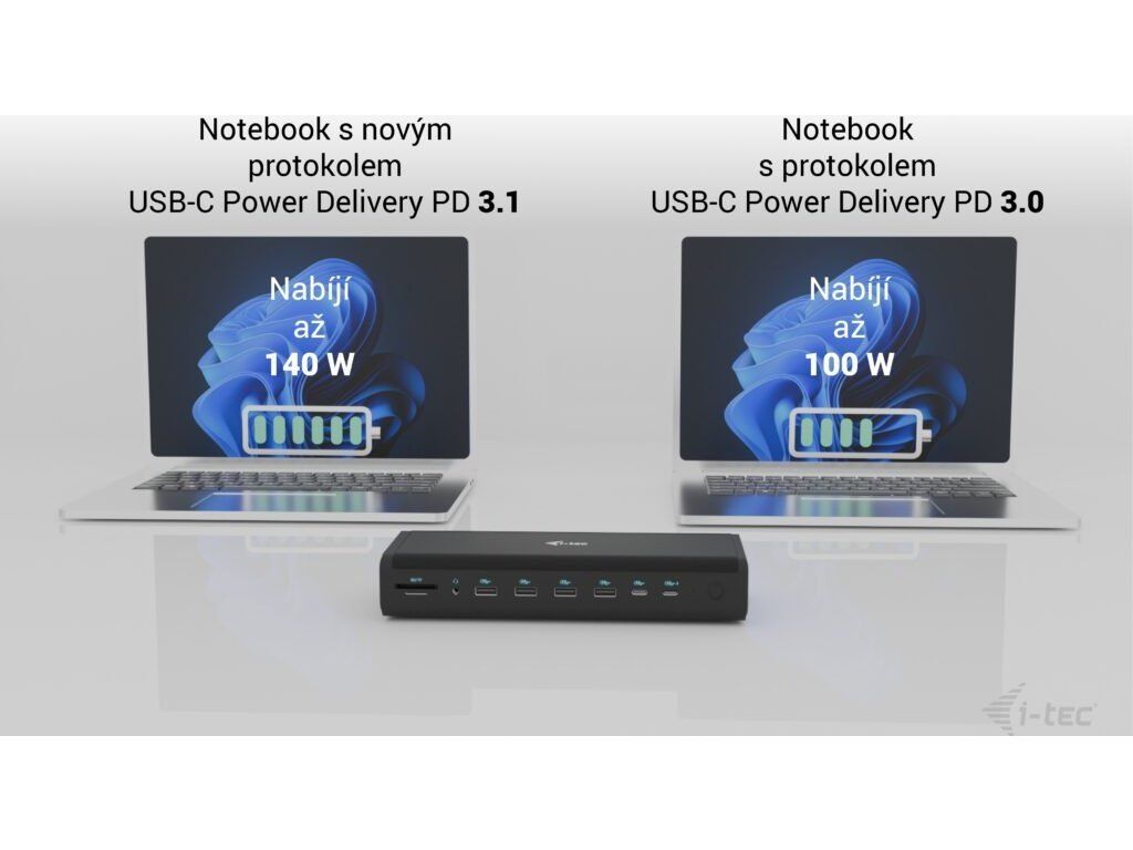 ** Pokud váš notebook nebo tablet podporuje nový a moderní nabíjecí protokol USB-C Power Delivery PD 3.1, dokovací stanice nabídne nabíjecí výkon až 140 W (pokud máte PD 3.0, nabíjecí výkon bude 100 W).