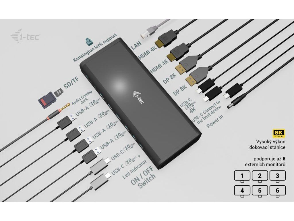 Dokovací stanice s nejvyšším možným výkonem! Podporuje až šest externích monitorů* s rozlišením 4K/60 Hz. Nebo dva mohou běžet současně i v rozlišení 8K! Ideální produkt pro uživatele, kteří vyžadují více monitorů, aniž by museli dělat kompromisy v oblasti stability obrazu, rozlišení a obnovovací frekvence. Dokovací stanice je také vybavena portem pro rychlé nabíjení USB-C (s nabíjecím výkonem až 30 W), zejména pro nabíjení smartphonů a tabletů, rychlými porty USB, portem LAN 2,5 Gbps, jakož i dalšími periferiemi.