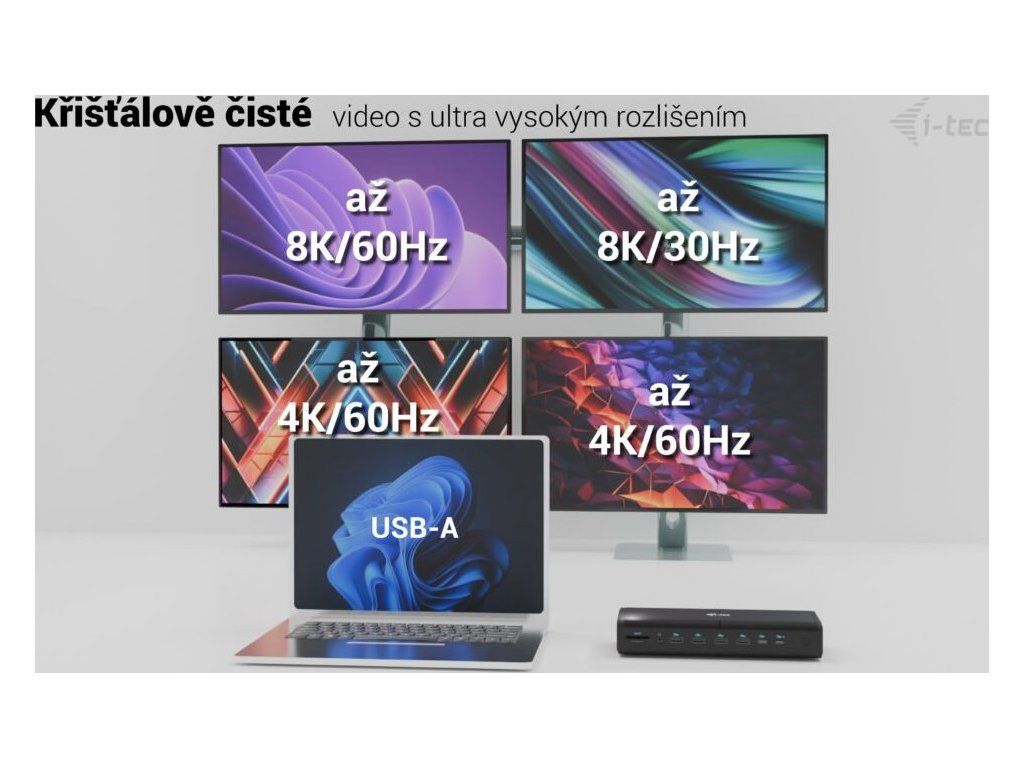 * V případě připojení přes USB-A budou podporovány pouze čtyři monitory přes porty DP a HDMI a nebude možné nabíjet notebook/tablet.