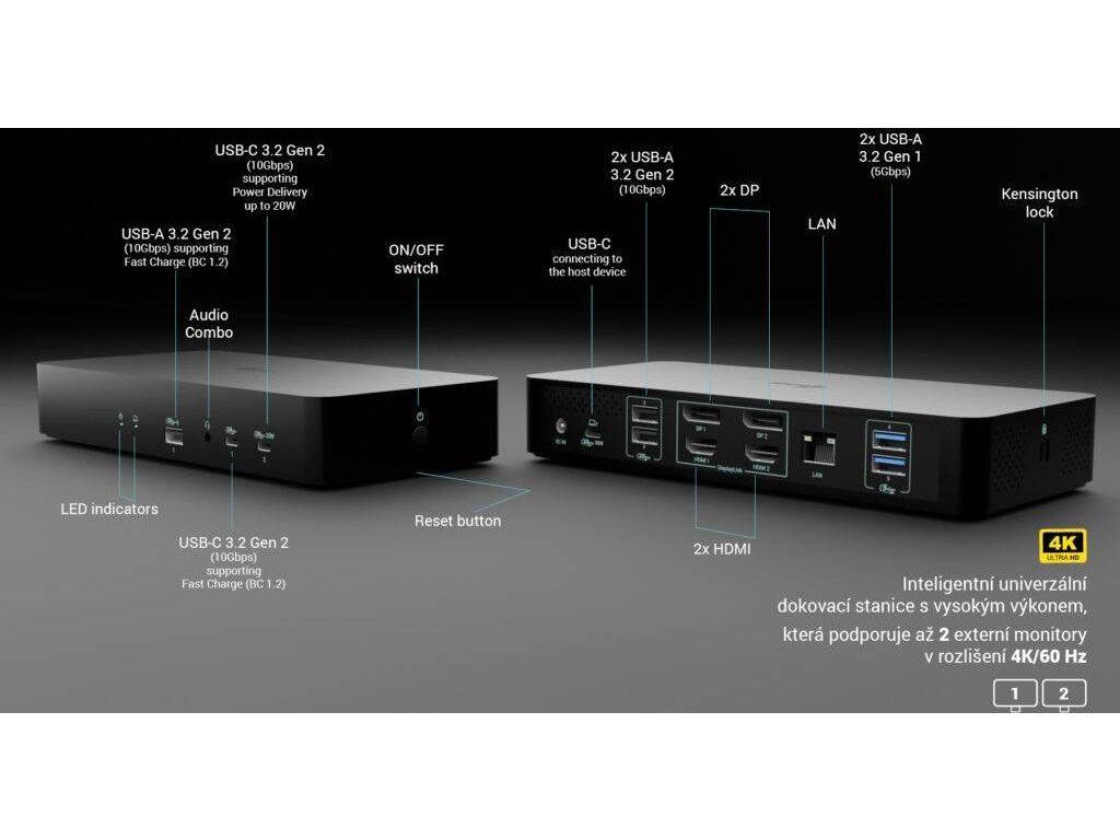 Tato profesionální dokovací stanice kombinuje technologii DisplayLink s USB-C Power Delivery pro maximální kompatibilitu a výkon. Díky podpoře všech běžných typů připojení (USB-A, USB-C, USB4 a Thunderbolt 3/4/5) ji lze použít s prakticky jakýmkoliv notebookem bez ohledu na výrobce. Stanice nabízí 7 USB portů včetně superrychlých USB 3.2 Gen 2 (10 Gbps) s podporou rychlého nabíjení.