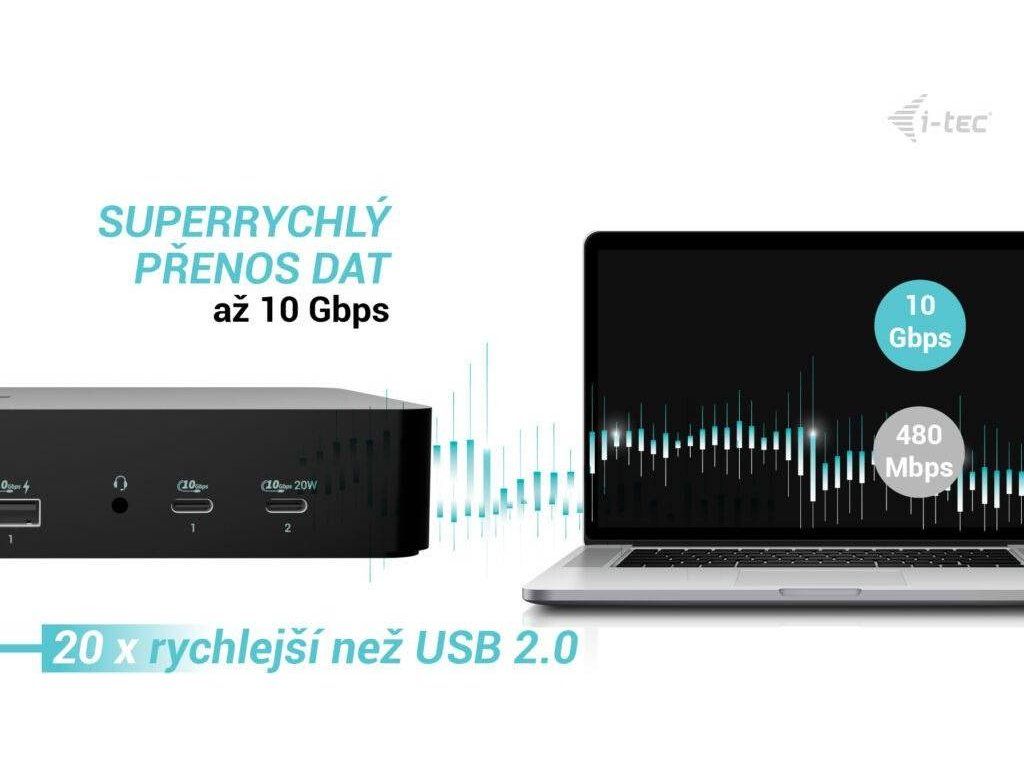 I-TEC Universal Intelligent Dual Display Docking Station nabízí 7 USB portů včetně super rychlých USB 3.2 Gen 2 (10 Gbps) s podporou rychlého nabíjení. Nechybí HDMI nebo DisplayPort výstupy pro připojení externích monitorů a podporu multitaskingu, práce s grafikou, videi nebo analýzy.