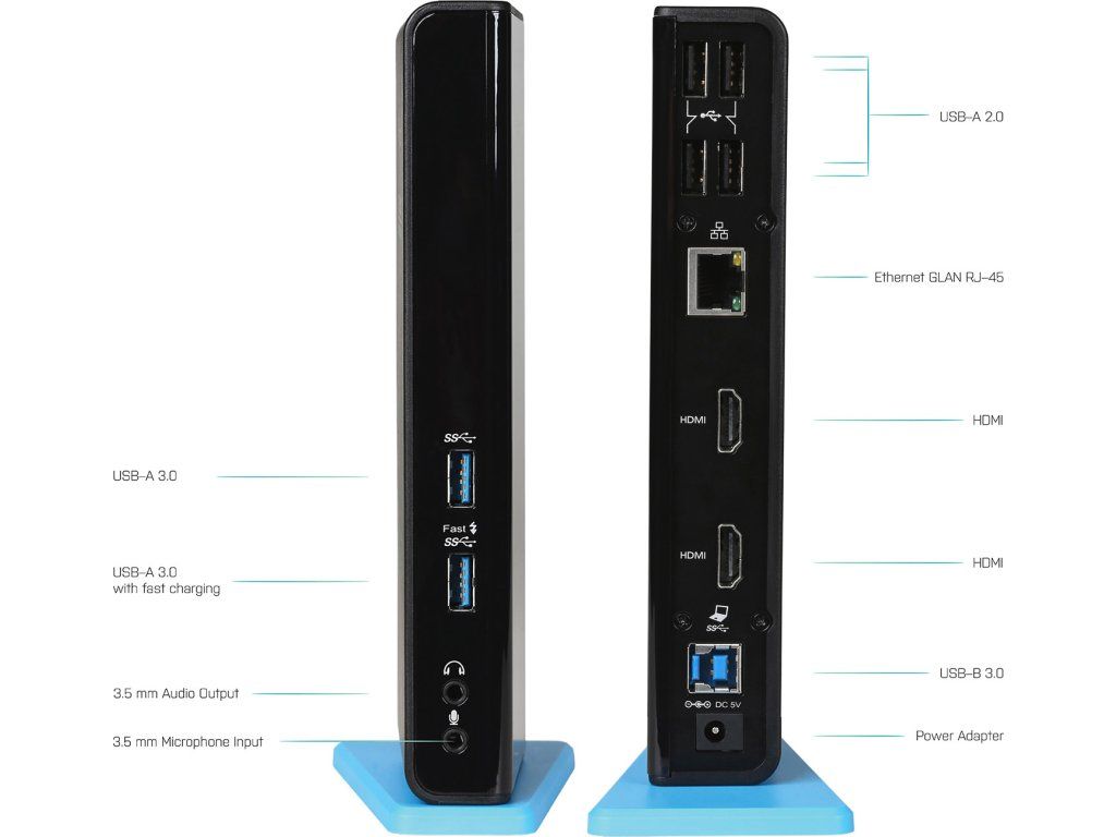 Stanice podporuje až 2x externí monitor, který připojíte díky HDMI portům. 6x USB port, spolehlivé a rychlé připojení k internetu díky integrovanému LAN portu a nechybí ani podpora audio vstupu a výstupu.
