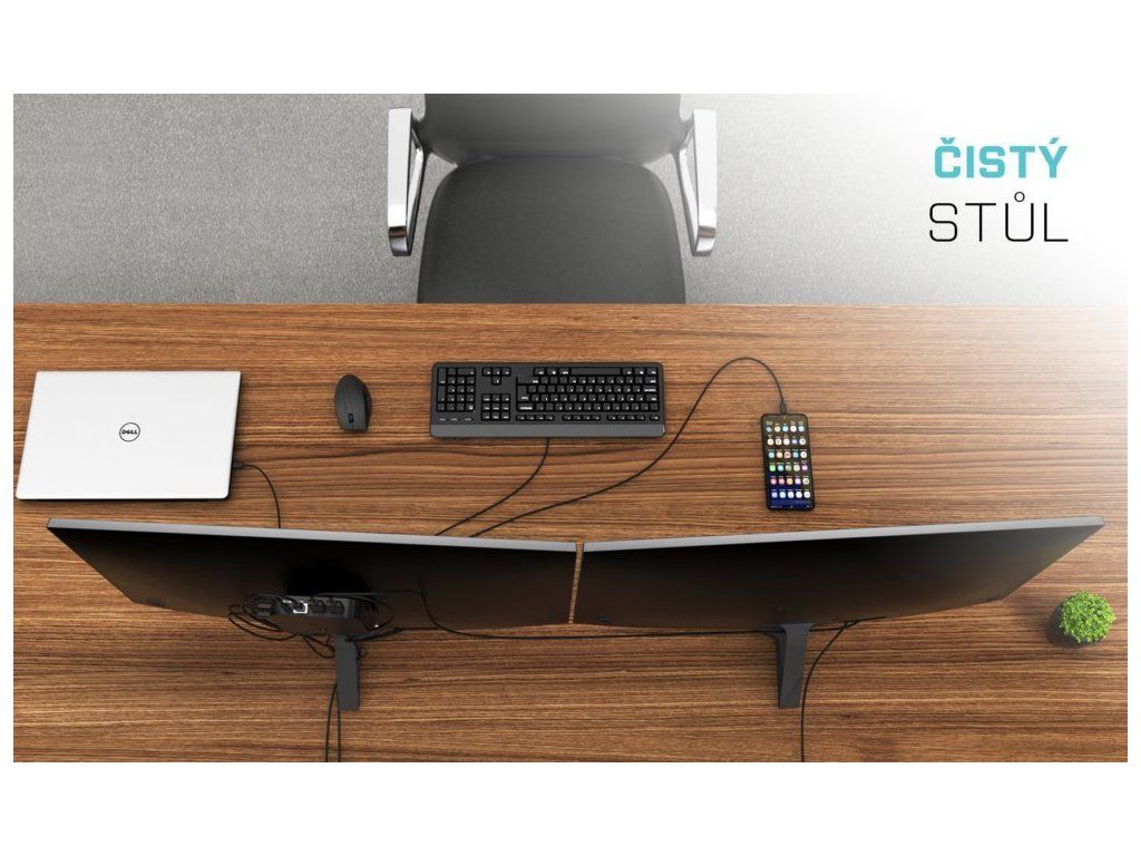 Kancelářská dokovací stanice USB-C, která podporuje až 2x externí monitor v rozlišení 4K. Stanice je kompatibilní s jakýmkoliv notebookem vybaveným portem USB-C nebo Thunderbolt 3. 6x USB port, spolehlivé a rychlé připojení do podnikové sítě díky integrovanému LAN portu a podpora instalace za monitor, to vše z této dokovací stanice dělá ideálního společníka pro profesionály. Samozřejmostí je podpora nabíjení vašeho notebooku či tabletu, a to až 100 W.