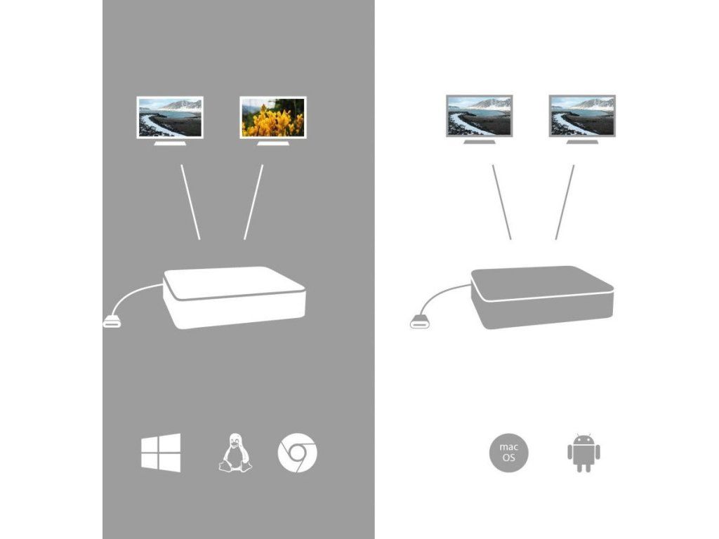 * Operační systém macOS nepodporuje technologii více-obrazového video přenosu Multi Stream Transport (MST), což znamená, že v případě připojení k macOS bude na obou připojených monitorech promítnut stejný obraz.