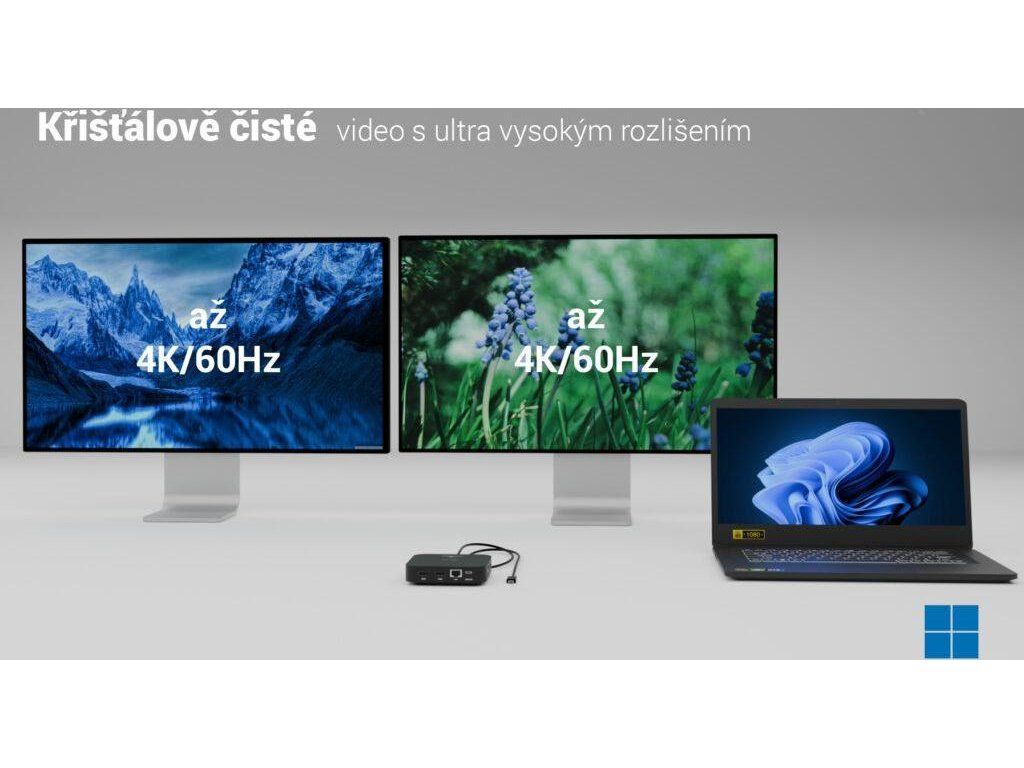 Univerzální USB-C dokovací stanice s podporou dvou 4K HDMI monitorů a napájením až 100 W.