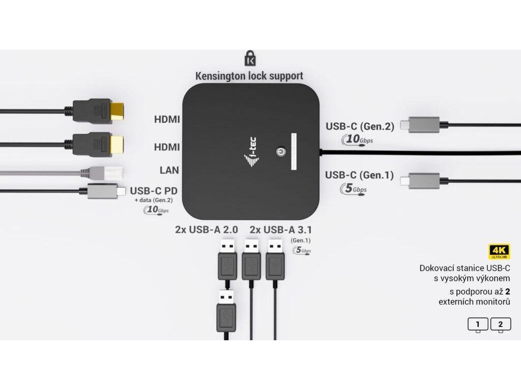 Moderní USB-C dokovací stanice pro kancelářské použití s podporou až dvou externích monitorů v rozlišení 4K. Stanice je kompatibilní s jakýmkoli notebookem vybaveným portem USB-C, USB4 nebo Thunderbolt 3/4/5. Nabízí 6 USB portů, spolehlivé a rychlé připojení k firemní síti díky integrovanému LAN portu a možnost instalace za monitor, což z ní dělá ideálního partnera pro profesionální použití. Samozřejmostí je také schopnost nabíjení notebooku nebo tabletu výkonem až 100 W.