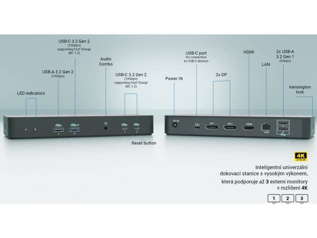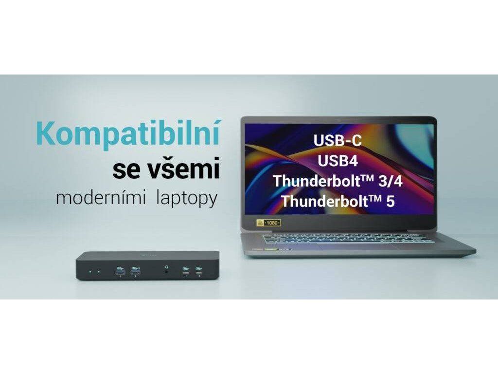 Dokovací stanice podporuje připojení až tří externích monitorů v rozlišení až 4K a je kompatibilní s notebooky vybavenými porty USB-C, USB4 nebo Thunderbolt™ 3/4/5. Nabízí celkem 6 USB portů, včetně rychlých USB-C a USB s podporou Gen 2 (10 Gb/s), gigabitový Ethernet a Power Delivery až 100 W pro nabíjení vašeho notebooku nebo tabletu.