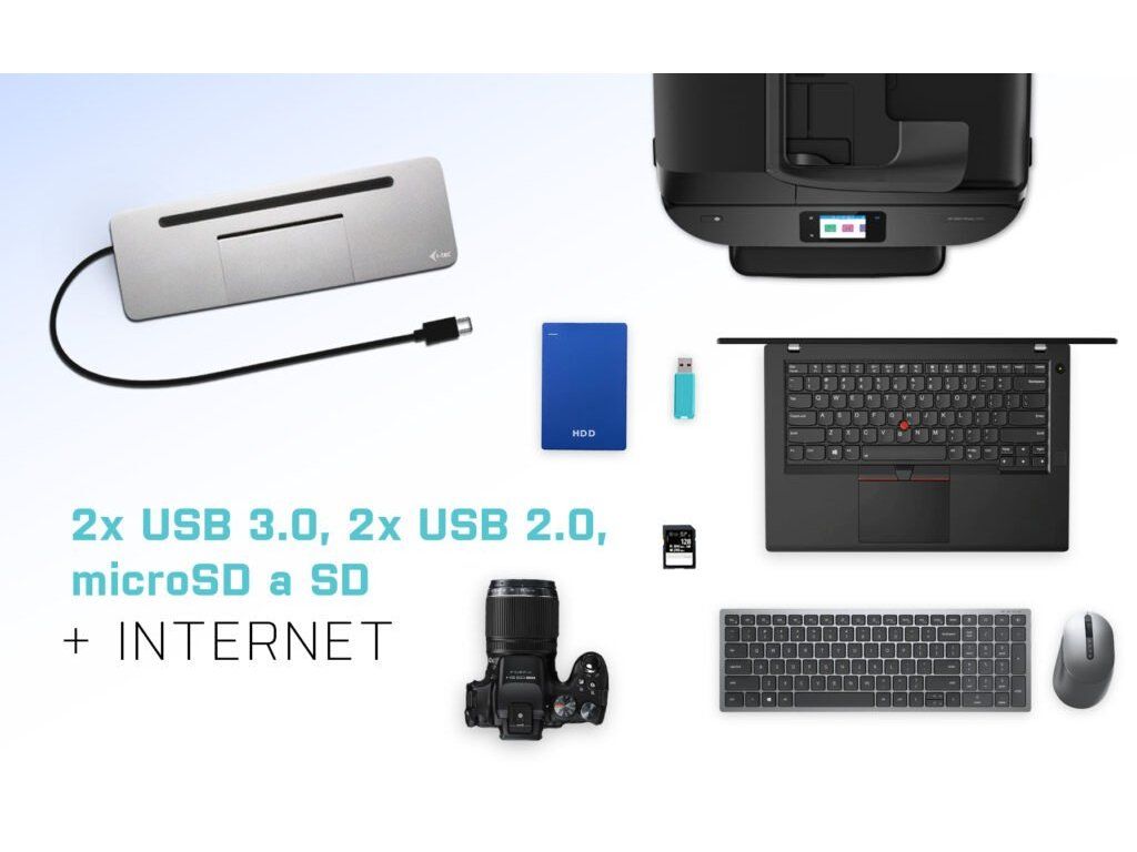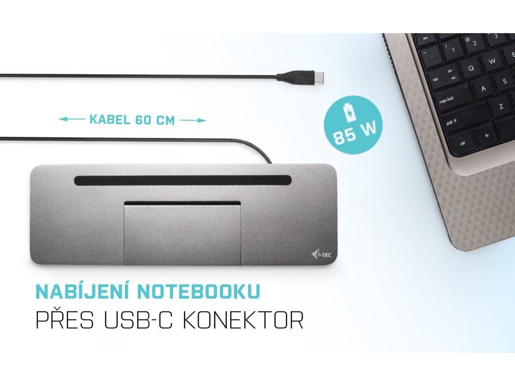 • Ergonomický design s hliníkovým krytem, dokovací stanice je vybavena integrovaným 60cm kabelem USB-C, takže je • • vhodná pro použití se všemi notebooky a tablety s displeji do 15" včetně.
