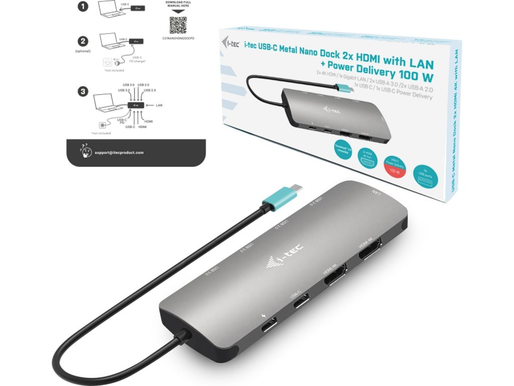 i-tec dokovací stanice USB-C Metal Nano/ 2x USB 3.2/ 2x USB 2.0/ 2x HDMI/ LAN/ Power Delivery 100W
