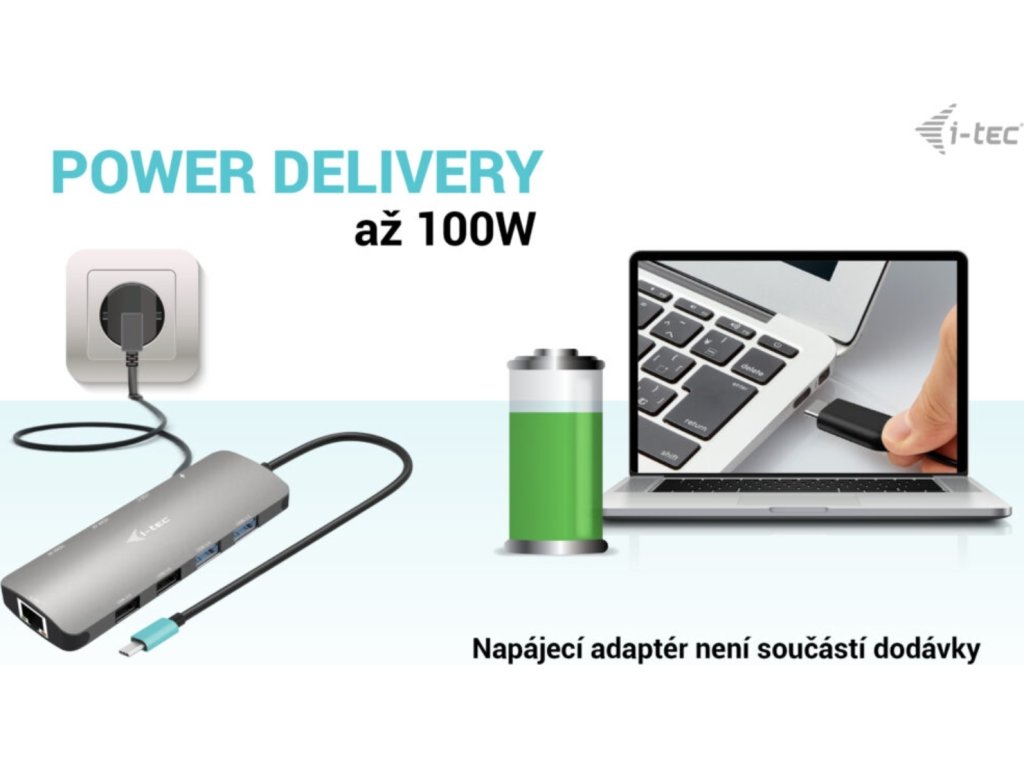 • Dokovací stanice podporuje až 100W napájení připojeného notebooku nebo tabletu (nabíječka USB-C není součástí dodávky)