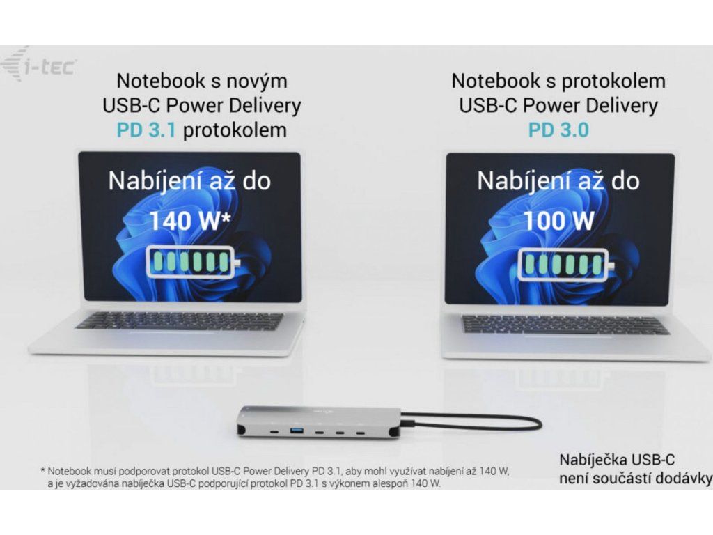 • * Pokud váš notebook nebo tablet podporuje nový a moderní nabíjecí protokol USB-C Power Delivery PD 3.1, dokovací stanice nabídne nabíjecí výkon až 130 W (pokud máte PD 3.0, nabíjecí výkon bude až 100 W).