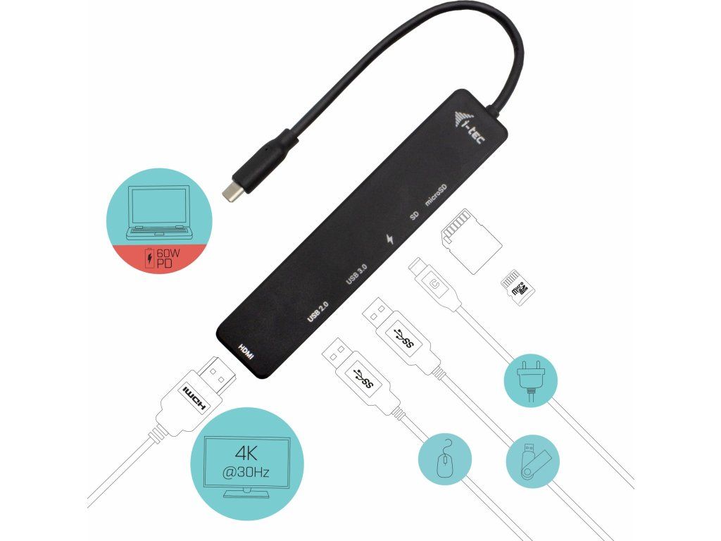 Malá dokovací stanice, která i přes své velmi kompaktní rozměry nabízí vše potřebné pro základní práci. Připojte externí monitor v rozlišení až 4K, dva USB porty poslouží pro připojení vašich periferií a čtečka SD a microSD karet pomůže s přenosem dat. Samozřejmostí je i možnost napájení vašeho notebooku, a to až do 60 W (napájecí adaptér můžete buď použít svůj stávající, případně si nabíječku dokoupit : https://i-tec.pro/produkty/?catg=nabijecky-a-baterie&kon=USB-C).