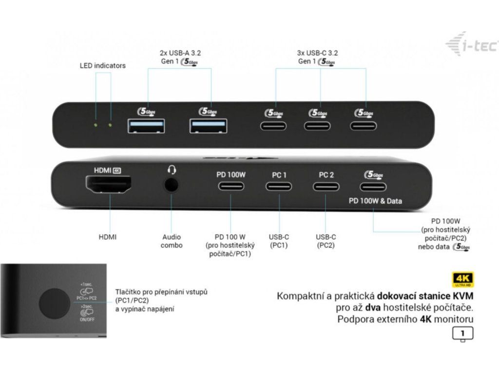 Dokovací stanice I-TEC USB-C KVM Dock představuje ideální řešení rovnou pro dva hostitele. Podporuje plynulé přepínání mezi PC1 a PC2, což znamená, že vám stačí jedna dokovací stanice pro provoz periferních zařízení na dvou počítačích. Stačí mezi nimi jen přepínat pomocí tlačítka. Dvojité výkonné napájení Power Delivery (2× 100 W), takže oba systémy lze nabíjet současně. Samozřejmostí je integrovaný KVM přepínač.