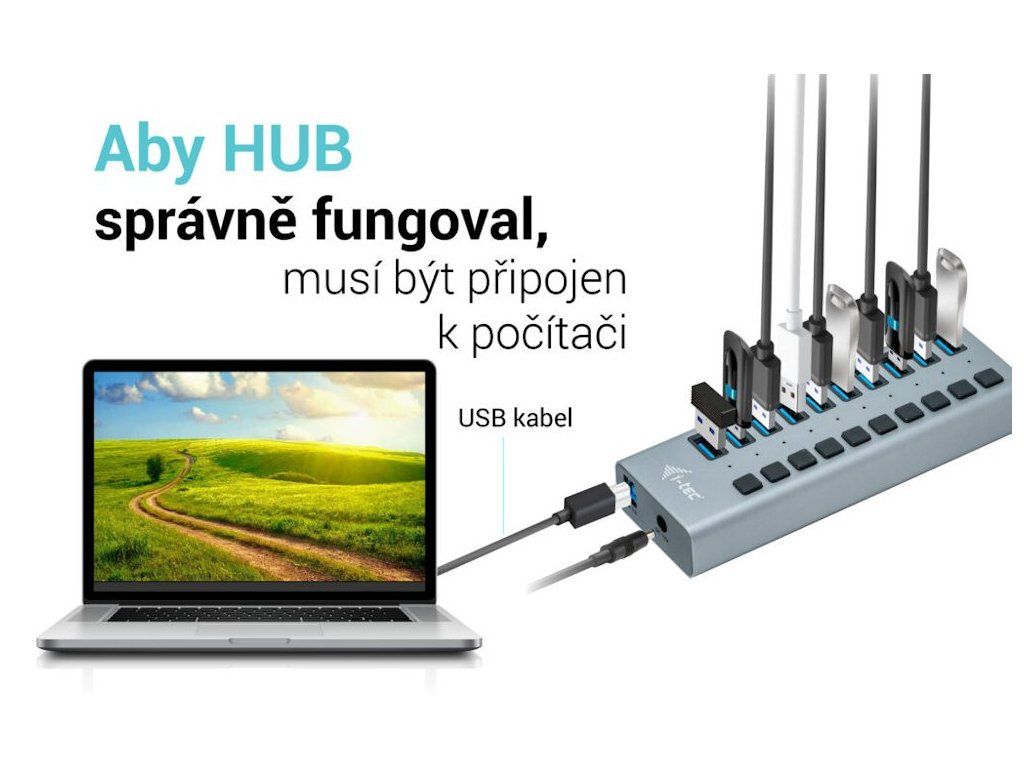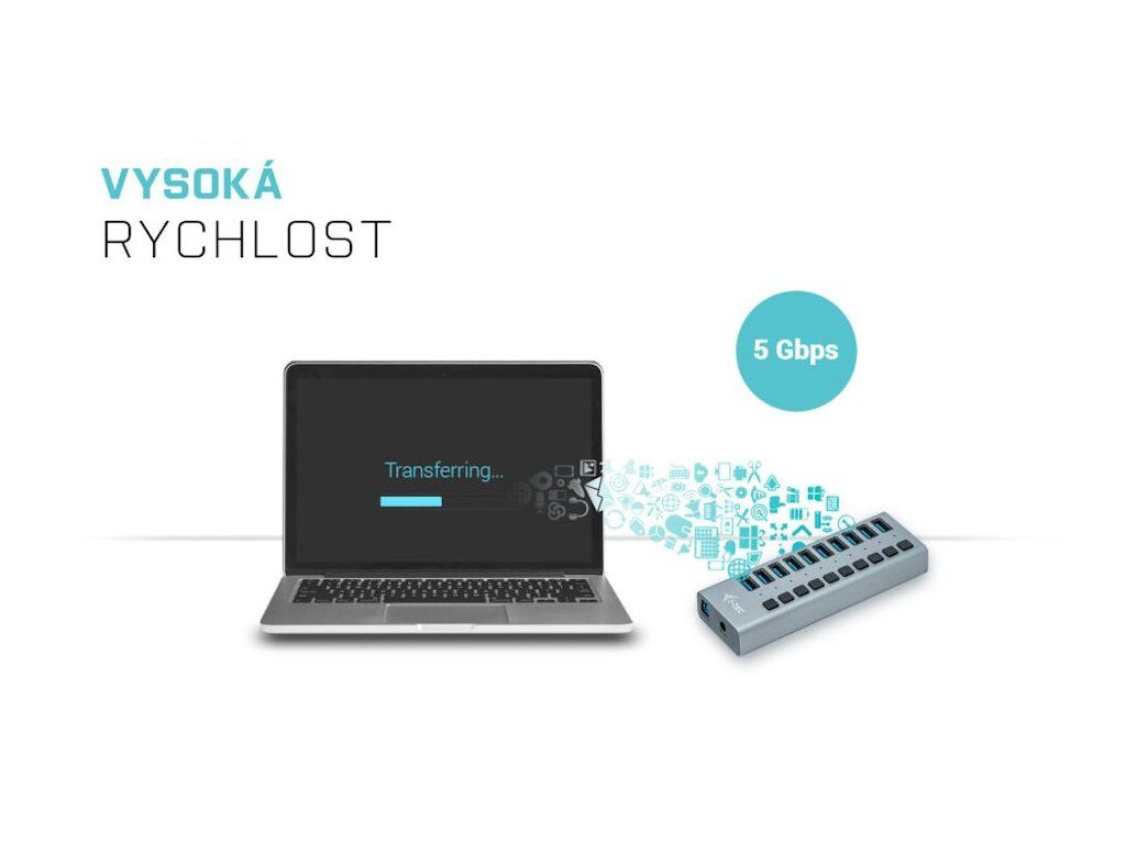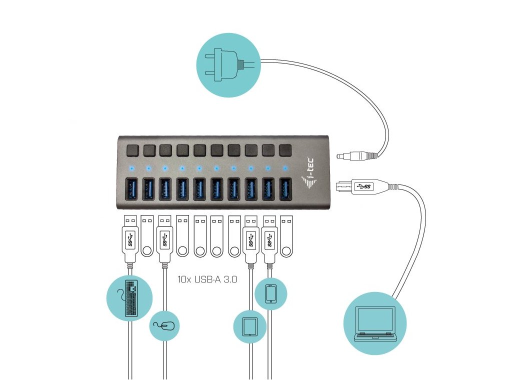 Tento HUB nabízí 10 USB 3.0 portů s funkcí Plug & Play a standardním USB nabíjením – HUB automaticky detekuje, jestli je připojeno zařízení pro USB nabíjení. Díky tomu, že HUB má 10 USB 3.0 portů, je možno nabíjet až 10 zařízení najednou. Rozhraní USB 3.0 je důležité zejména pro datové přenosy z USB 3.0 paměťových karet a flash disků, kde se nejvíce využije jeho vysoká přenosová rychlost. K balení je přiložen externí napájecí adaptér, bez kterého se HUB neobejde. Napájecí adaptér vám zaručí stabilní nabíjení z USB portů a výkon HUBu, poskytující nabíjecí výkon až 10 W na jeden port.