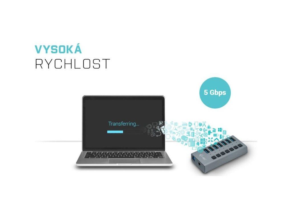 Tento HUB nabízí 7 USB 3.0 portů s funkcí Plug & Play a standardním USB nabíjením – HUB automaticky detekuje, jestli je připojeno zařízení pro USB nabíjení. Díky tomu, že HUB má 7 USB 3.0 portů, je možno nabíjet až 7 zařízení najednou. Rozhraní USB 3.0 je důležité zejména pro datové přenosy z USB 3.0 paměťových karet a flash disků, kde se nejvíce využije jeho vysoká přenosová rychlost. K balení je přiložen externí napájecí adaptér, který vám zaručí stabilní nabíjení z USB portů a výkon HUBu, poskytující nabíjecí výkon až 10 W na jeden port.